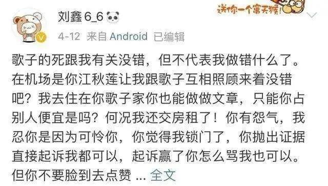 1. 刘鑫非常擅长扮软弱,而她的软弱是有条件的,那就是必须对方是能够威胁她,或是她能够利用上的。在江歌案事发后的三百多天中,她从未对江母表示出任何友善与仁慈,甚至多番言语挑衅,刺激江母,因为她觉得江母不会威胁到她。对于救命恩人与挚友江歌,她也曾极力撇清关系,说过“一开始不认识江歌就好了”“江歌死是她命短”。