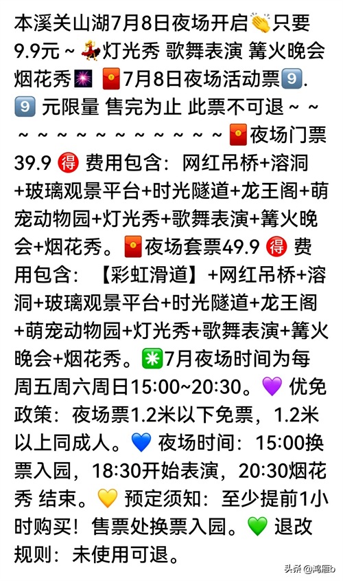 最新消息,关山湖景区将于7月8日起开启夜场活动,请注意看具体事项。