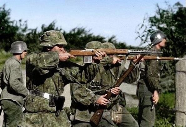分别使用stg44突击步枪和G43半自动步枪协同射击的德军士兵,这种组合的火力密度绝对令盟军头疼