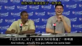 所以在当时火箭以4比2的大比分淘汰掉开拓者以后,姚明和其他队友的心情都非常好,打的也是非常拼,甚至在最后一分钟,姚明的队友阿泰斯特还为了救球直接冲进了观众席。赛后发布会上有记者提问阿泰斯特:“最后一场比赛结束前一分钟,冲进观众席救球什么感受?”而阿泰斯特的回答是“我又不是第一次冲进观众席”,我们都知道曾经阿泰斯特在步行者的时候,在活塞主场打出了NBA历史上最严重的斗殴事件——奥本山宫打架事件,当时的阿泰就是瞬间冲向了观众席暴揍球迷,所以一旁姚明调侃道:“不过这次是冲进了自家的观众席。”阿泰也说:“扑进观众席救球时还有人递给我啤酒(奥本山宫事件就是因为球迷泼阿泰啤酒),我一想不行,身边还有摄像机对着我,可不能要。”这番话也是瞬间逗乐了姚明以及全场的人,而姚明也正是在这个时候笑出了那标志性的表情包。