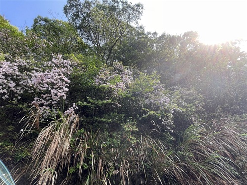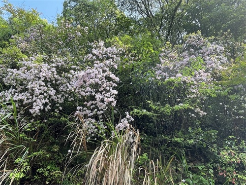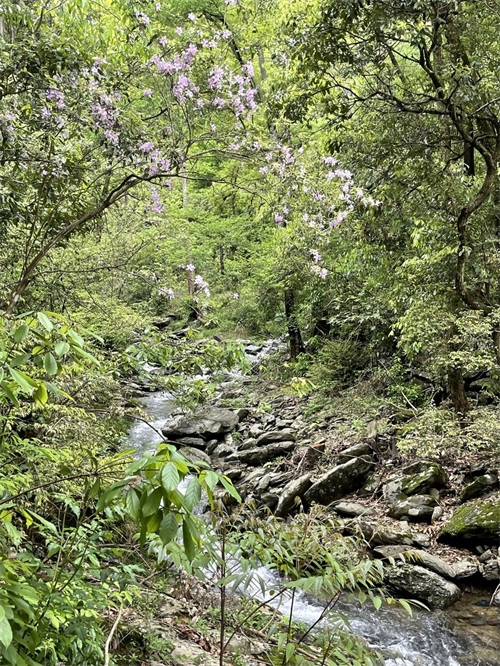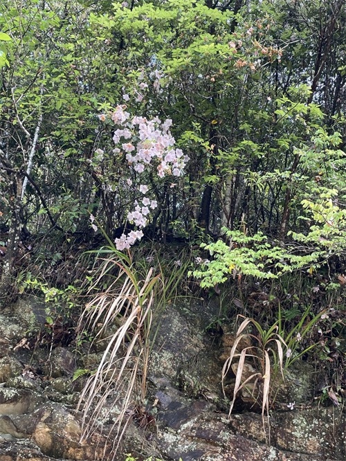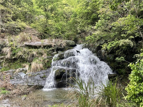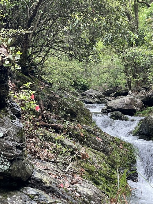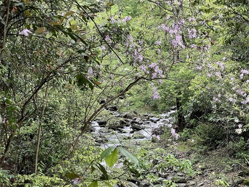 五:离开柯村,沿着Y025向北的线路,就是通向新四军军医院的通道一路骑行,快到目的地的一个小桥处右拐,再次进入深山之中,这条路叫Y021,一直通向美溪河大河口,交界处是一个大型的石拱桥。这条路是今天的福利,一路上大大小小的几十条瀑布从山林的奔流而出,沿路都是瀑布激扬清越的声音;快到终点时,进入高潮,一个大型的瀑布出现眼前,瀑布水流湍急,奔越山林而下,而瀑布出自的山林峡谷,清幽雅致,让人留恋不舍。更加叫人叫绝的是,溪流边上总会有那么一株或者两株,或是深红,或是浅紫的杜鹃花在溪水边绽放,如果美妙的仙女在溪流边凝神,那一份宁静的艳丽、优雅、柔和而又不失热烈,给人无尽的遐想。