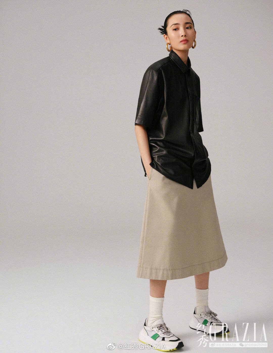 可黑白可彩色,彩色这组穿搭黑色上衣搭配裸色长裙再搭配长筒袜,虽然遮住了大长腿,但是却是依旧很帅气十足。又man又酷又霸道,真的是要吹爆王梓璇的表现力。