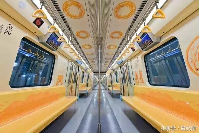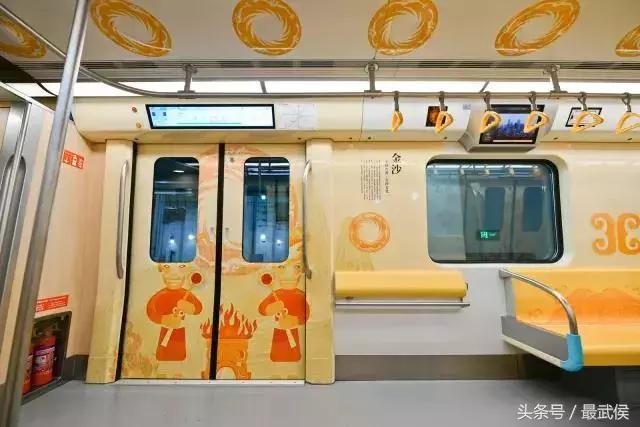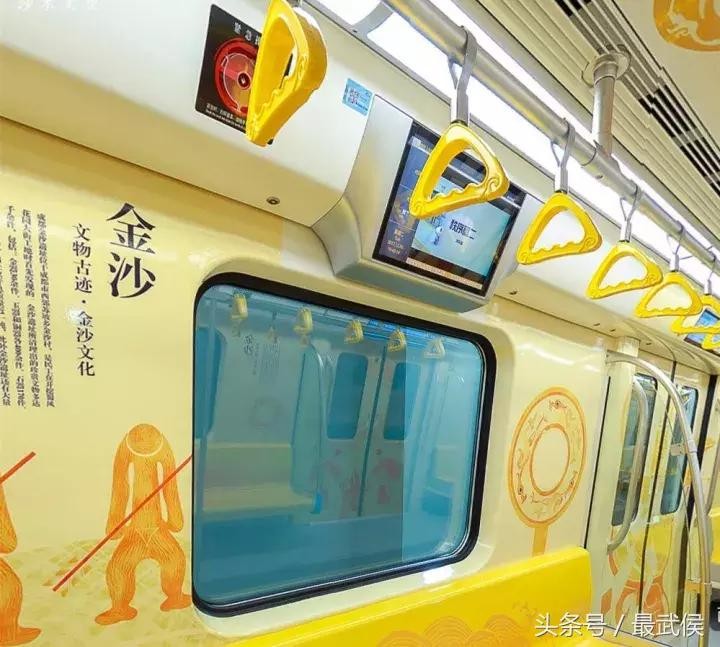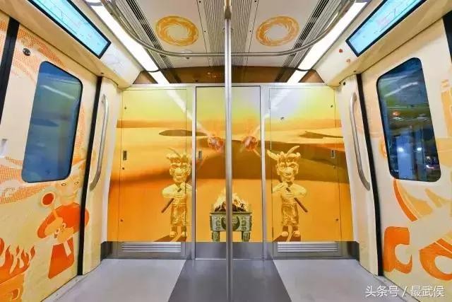 四幅主题画面——骑神鸟的射箭者、手捧祭坛的大祭司、守护祭坛和太阳神鸟的金沙武士,还有祭坛圣火中锻造的黄金面具,模仿敦煌壁画的表现形式,分别绘制于车厢内部每扇车门以及司机门上,让乘客仿佛穿越到三千年前,亲眼见证一场盛大的祭祀仪式——这就是今天,7号线开通试运营首发现场首列车“真容”。