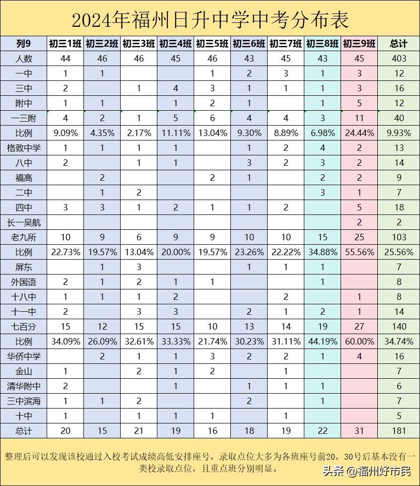 数据整理如下:整理后可以发现该校通过入校考试成绩高低安排座号,录取点位大多为各班座号前20,30号后基本没有一类校录取点位,重点班一看便知。