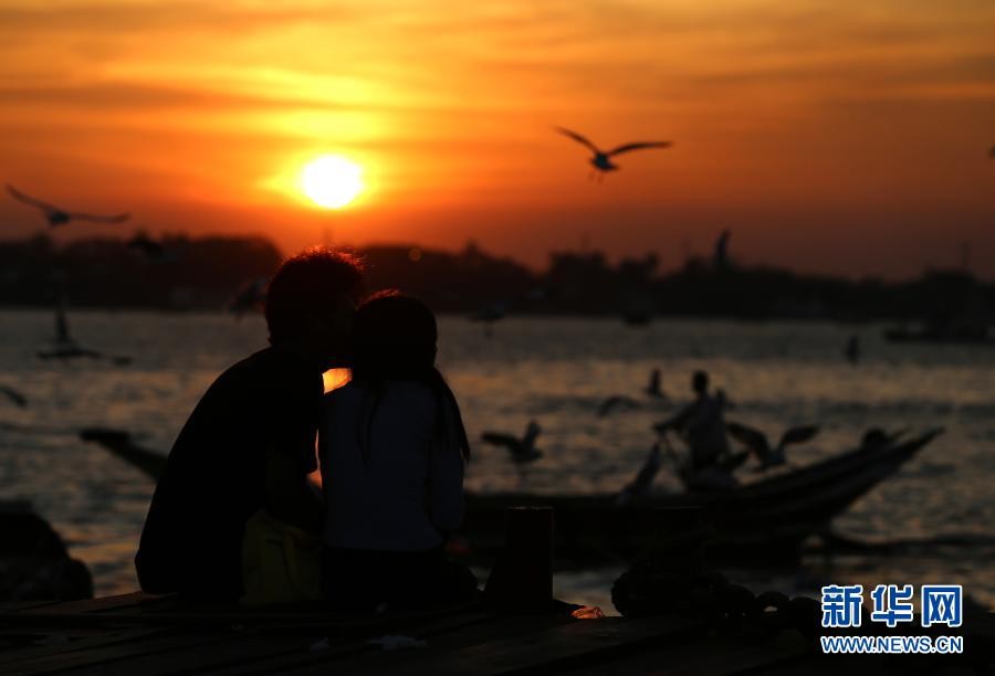 一对情侣在缅甸仰光欣赏河边落日(2016年12月20日摄)。