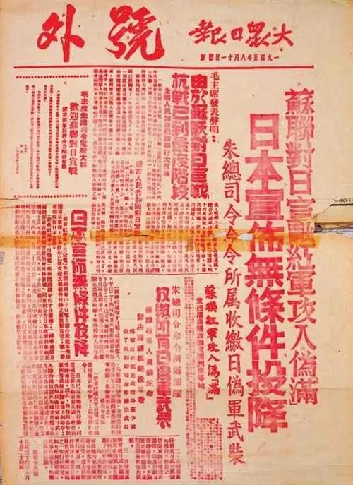 - 8月15日中午12时,日本昭和天皇向日本全国以录音电台广播的方式发表《终战诏书》,宣布日本政府无条件投降。