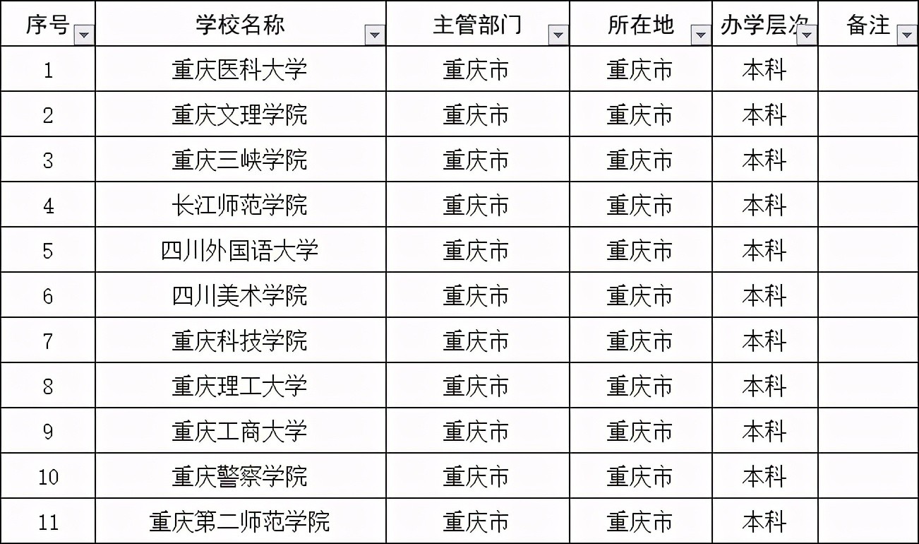 重庆26所本科院校中,除去重庆大学、西南大学等一本院校,重庆工商大学派斯学院、重庆邮电大学移通学院等独立学院,以及重庆机电职业技术大学等民办本科院校后,只剩下11所二本大学,包括重庆医科大学、重庆文理学院、重庆三峡学院等,具体名单如下: