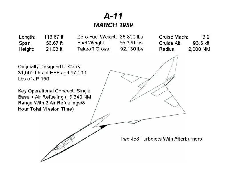 与此同时,康维尔公司重新提交的设计“石首鱼”(Kingfish)不再是空中发射,其最高速度达到3.2倍音速,航程接近6300公里。尽管GUSTO委员会喜欢洛克希德的设计,但他们认为其雷达反射截面过大。这促使凯利·约翰逊逐步改进设计,最终形成了A-11,原始雷达反射截面减少了90%。