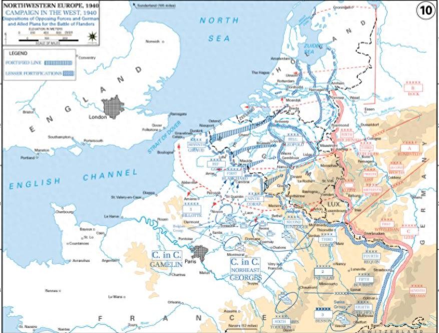 1930年代,法国沿着东部法德边境建造了著名的“马奇诺防线”,使法国东部边境坚固如铁桶,德军如果要攻击法国,必须要借道比利时,如果从“马奇诺防线”强攻法国,伤亡太大,如此,将德军的攻击局限在比利时一带,此后法军便可用最精锐的部队迎击德军。如此便可将战事限制在法国领土之外,法军高层的思想还是和一战一样,决定以静制动,等德军先发动攻击,法军凭借防御工事消耗德军,所以英法当时虽然处于对德战争状态,交战各方开始了一段几乎没有军事冲突的时期