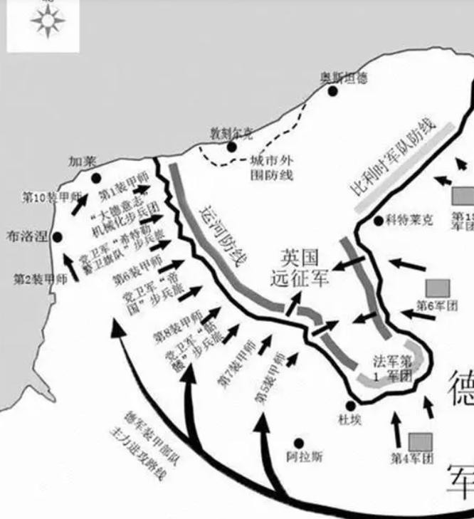5月22日早,终于镇定下来的最高统帅部下令第19装甲军向北挺进,从阿布维勒向海港进军:命令第1装甲师攻加来、第2装甲师攻布洛涅、第10装甲师攻敦刻尔克。后来第1装甲师和第10装甲师交换了进攻目标。