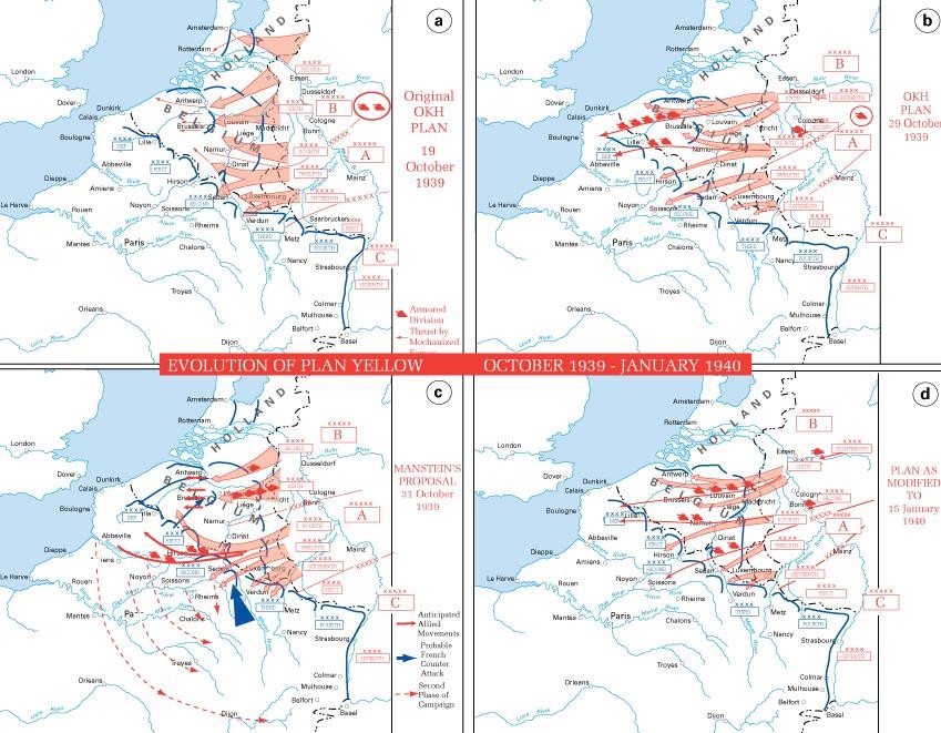1940年1月10日,一架德军Bf 108飞机因大雾迷航,在比利时的马斯梅赫伦迫降。德国空军一名军官搭乘该机,正携带德国空军向比利时进攻的计划文件。因德国空军军官未能及时销毁文件,因而这份计划很快地落入盟军的情报机构手中,在泄密事件后,德军推定盟军对德国意图的认识会进一步加强。决定采用曼施坦因计划,希特勒预测战役只需要六周时间,就能击败法国,于是德军主攻方向换到了南方的阿登地区。20个师(包括7个装甲师和3个摩托化步兵师师)从正面B集团军群调动到面对阿登的A集团军群。