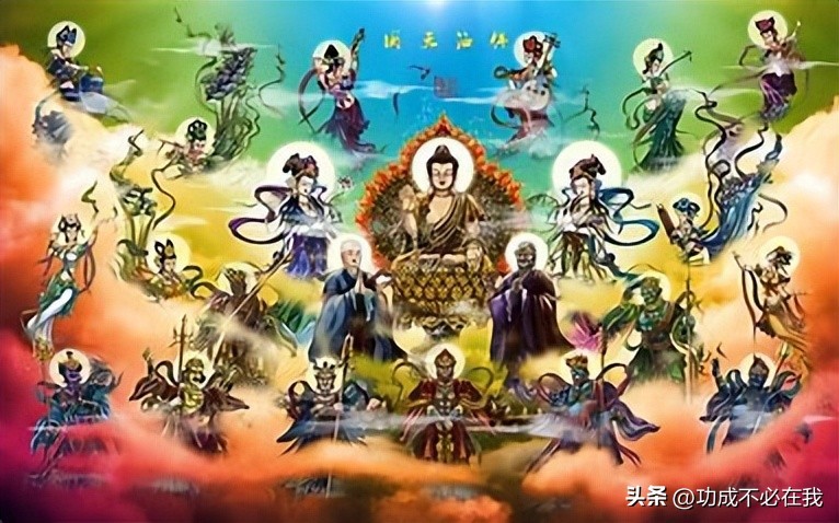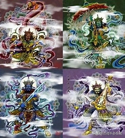 四大天王:至胜金刚、泼法金刚、大力金刚、永住金刚。守卫灵山大雷音寺。
