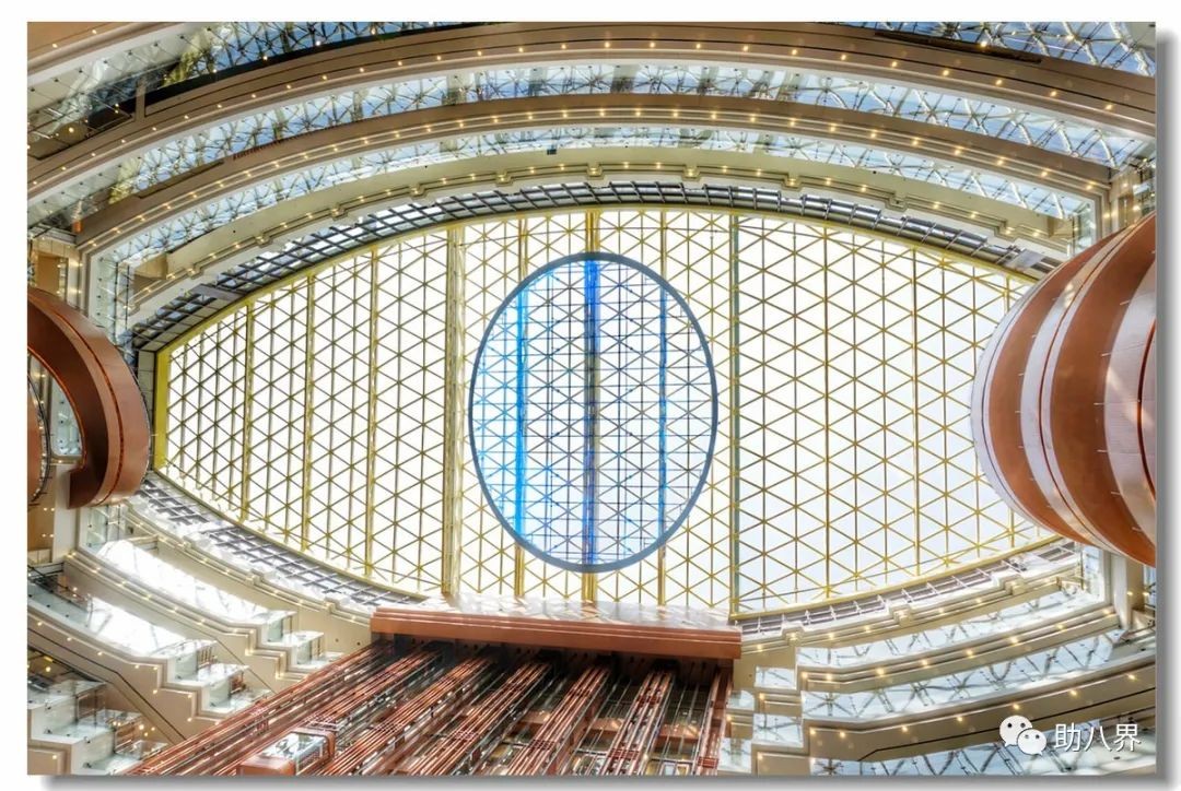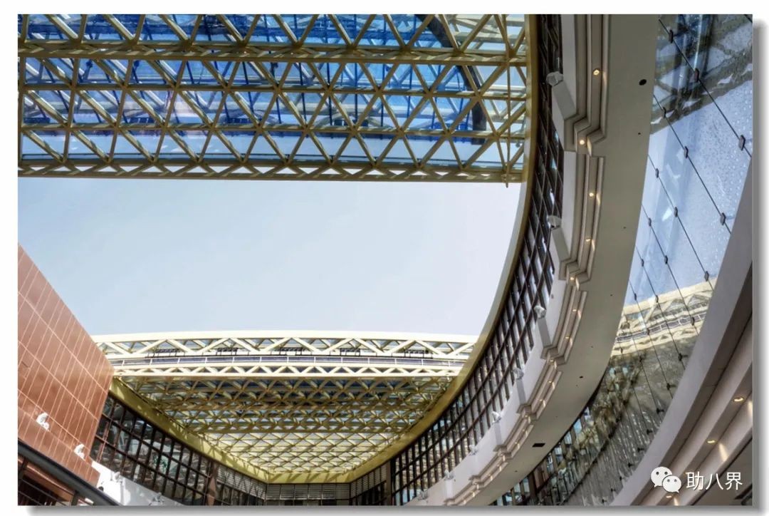 白天,自然光线可以透过玻璃天花板照射到购物艺术中心的所有角落;晚上,底部的人工漫射光源则将地下二层中庭映射得金碧辉煌。