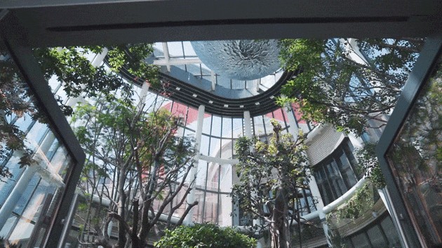 尤其值得一提的是「鹤栖」中庭。这个跨楼层、植物园式的休憩中庭,面积达1000平方米,有200多种国内外引进植物。其内部又设计了3大生态盒「森林、湿地、高山」,一是521平方米的热带植物空间,被称为“觅境·森林”;其二是301平方米的湿地空间,身临其中能够欣赏到支流与润雨,被称为“小憩·湿地”;其三是265平方米里矗立着的12米高“山丘”,让空间与屋顶花园有机交融。