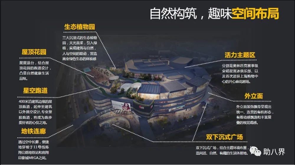 在场景设计上,拥有3大沉浸式生态空间、双下沉式广场、天空跑道、屋顶花园、退台幽径、萌宠乐园、户外婚礼、露天酒吧等特色主题活动空间。