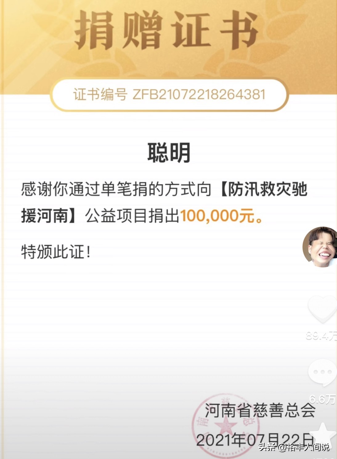 虽说质疑声音至今犹在,但郭聪明这些年在慈善方面的贡献也不少,20年1月,向武汉新冠状病毒疫区捐赠20万元 。2021年7月22日,向“防汛救灾驰援河南”公益项目捐赠10万元。