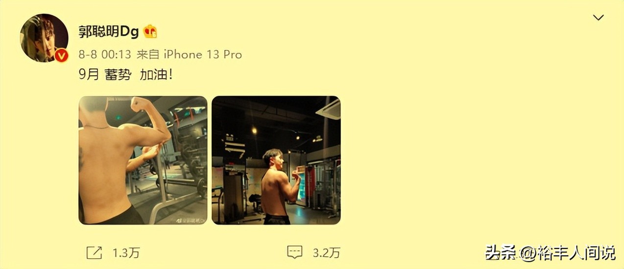 其实,在郭聪明的社交网上也能了解到他复出的时间,从8月初开始,郭聪明便不断晒出健身照,还曾留言说道:9月,蓄势,加油。