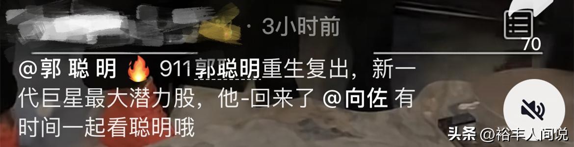9月4号,一位集团的负责人于视频账号上曝光了一段三人合照,并特地艾特了郭聪明的账号,留言说道:911郭聪明重生复出,新一代巨星最大潜力股,他回来了。