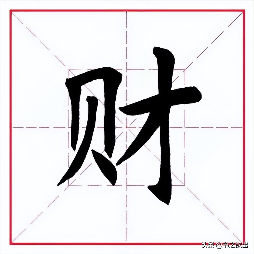左边“貝”字旁斜势抗肩,左伸右收,不要写宽。左竖斜切起笔,稍重,向下行笔略轻,稍左斜;横折与左竖虚接起笔,横画勿重,抗肩,行笔到位后向上稍抬笔锋然后顿笔向下内擫写右竖,竖身稍重,稍长,与左竖略呈相背之势;里面两个小横抗肩角度一致,不要写重,间距相等;底横起笔左探,向右抗肩上行,托住左竖,与上面横画平行等距,收笔藏于右竖;下面“八”字撇笔位置靠左,注意弯度,勿重;点笔略长,重心与右竖对应。