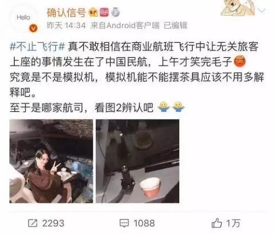 随微博发布的图片中,一名年轻女性在与民用客机驾驶舱高度疑似的环境中,摆出“V”型手势自拍,面前的小桌板上有3个喝茶用的茶具,原微博中还配有“超级感谢机长,实在是太开心了”的文字。