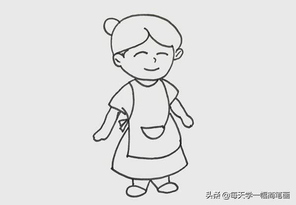 步骤二:往下画出衣领,画出妈妈的围裙,画围裙的时候注意褶皱、口袋还有后面的系绳,接着画出里面的长裙,在袖口处画出妈妈的手臂。