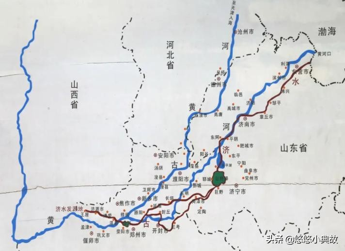 济水,古河名,发源于今河南济源,流经河南、山东入渤海。今济源、济南、济宁、济阳,都从济水得名。现在黄河下游的河道基本就是原来济水的河道。