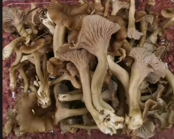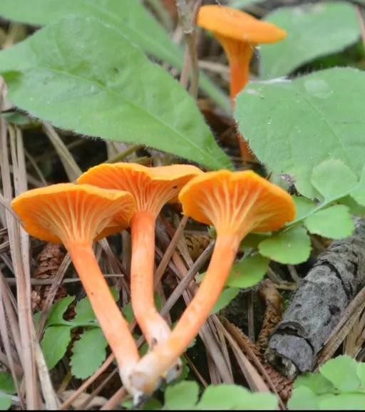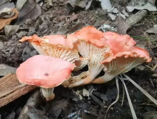 这种既好看又好吃的野蘑菇,学名叫鸡油菌,大部分地区有分布,可食,味道好。它的两大特征是:一、新鲜的时候,你闻一下,它有桂花的香气,这种香气也可以说是杏 熟透的气味,在各种野蘑菇当中,只有鸡油菌家族有这样的气味。二、它背面的夹角是一个钝角。鸡油菌有很多种,都是可食的。