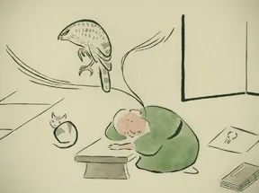 本片讲述了一个以梦境为载体的奇幻故事,通过超现实画面探索人与自然、记忆与存在之间的微妙联系。山村浩二在影片中延续了他对哲学命题的思考传统和标志性的手绘风格,结合水墨与拼贴技法,以流动的线条和富有诗意的色彩呈现梦境碎片,画面充满东方美学的空灵感与现代实验动画的抽象性。