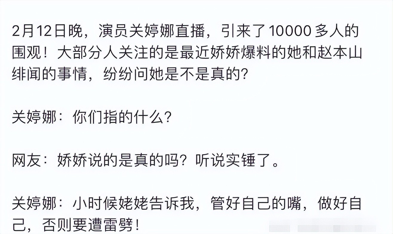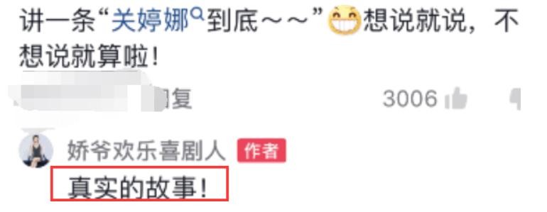 于是,当网友问关婷娜和赵本山的事情,眼尖的娇娇一眼就看见了这条评论,还回复到“真实的故事”。