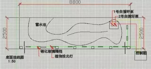 瀑布为隐藏式出水口,感觉像是从山石缝里流出来的;瀑布落入水潭,贯穿中景和前景,将整个景观联系在一起;溪流进行分流,多设计几个回路,增加缸的湿度;溪流做在底床里面,代表地下河
