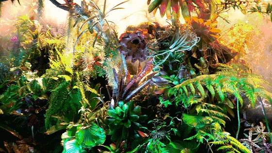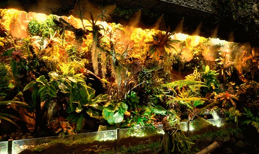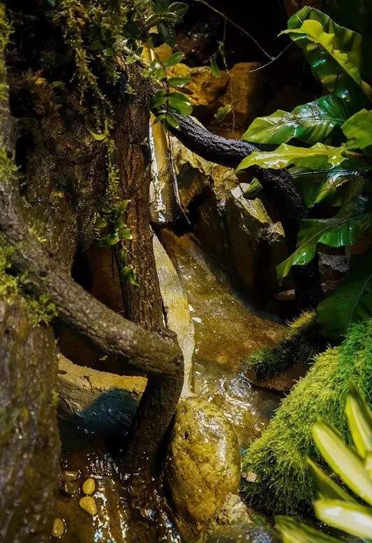 以沟谷雨林为原型制作的。最典型的就是独木成林、多层结构、藤萝缠绕、滴水叶尖、瀑布溪流、云雾变幻、繁茂的附生和气生植物。