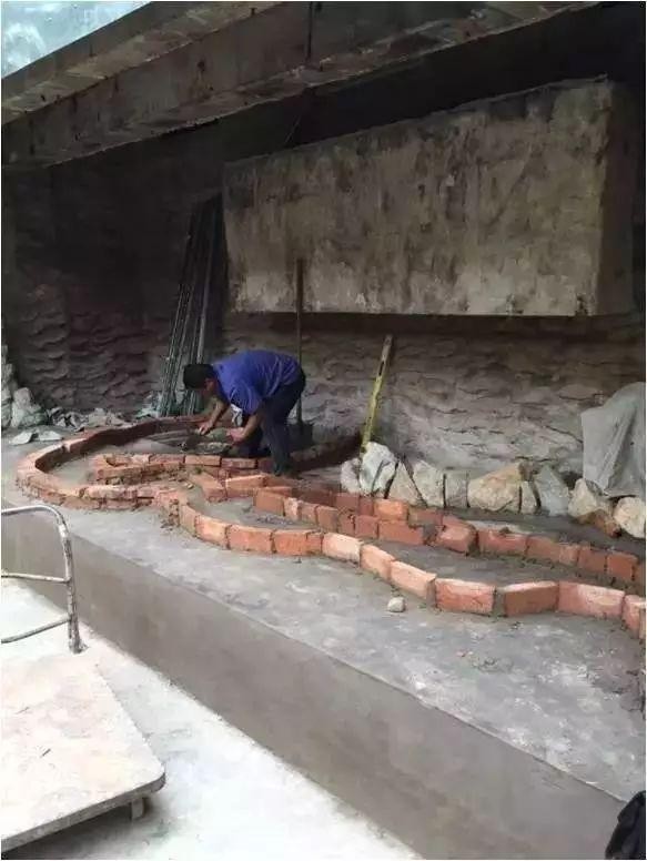 一边搭骨架,一边水系要同步开始试运行:瀑布落入水潭,从水潭再分流,流经整个主景,再汇合进入最左边的下水孔,然后用泵再抽到水箱,再循环
