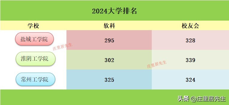 软科榜单上,前后顺序分别为盐工、淮工和常工院;而校友会榜单上确实常工院、盐工和淮工。