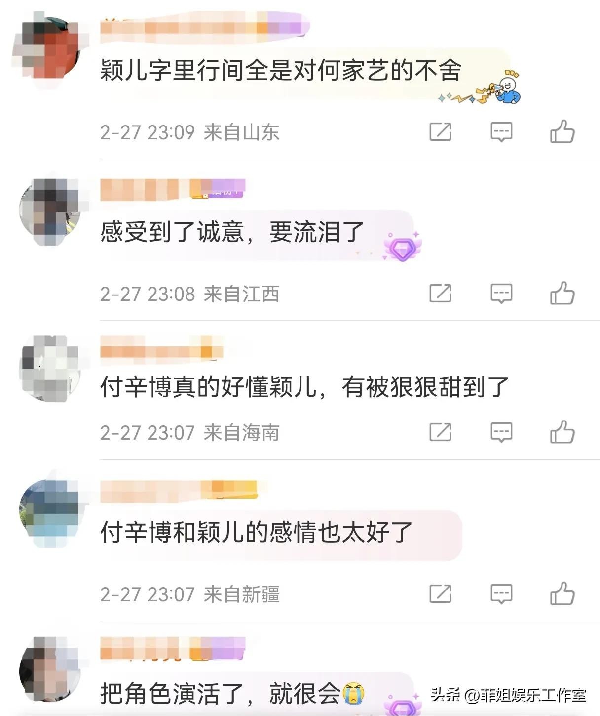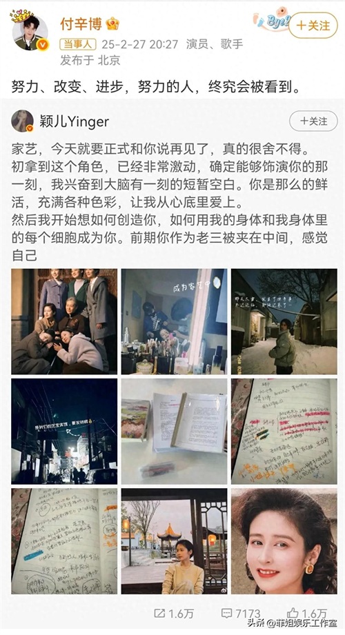 颖儿字里行间全是对何家艺的不舍,可见颖儿对这个角色的珍视,而与此同时付辛博转发老婆颖儿的文案,进行宣传:“努力、改变、进步,努力的人,终究会被看到”,