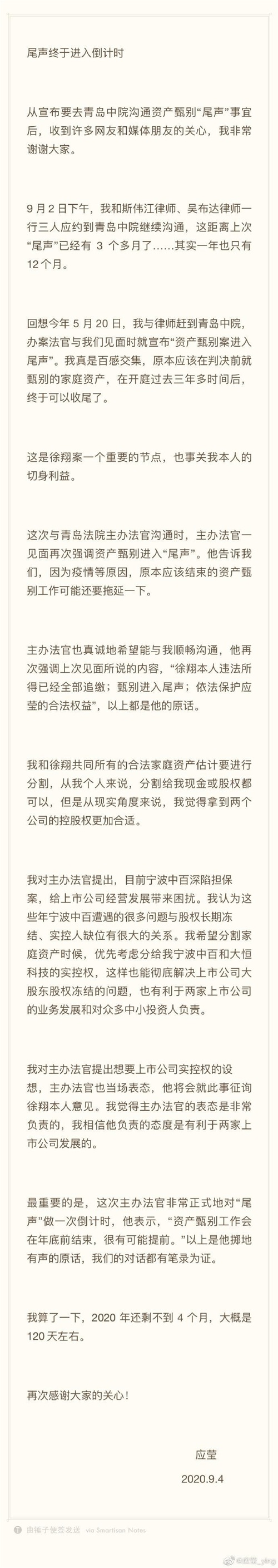 9月4日消息,徐翔妻子应莹发微博表示:尾声终于进入倒计时。从宣布要去青岛中院沟通资产甄别“尾声”事宜后,收到许多网友和媒体朋友的关心,我非常谢谢大家。