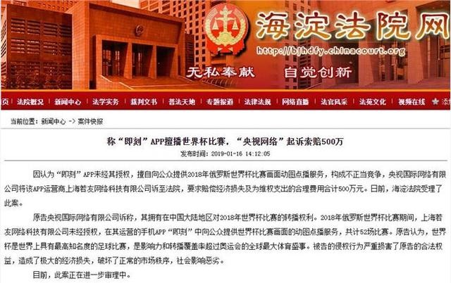 今日下午,海淀区人民法院发布公告称,因认为“即刻”APP未经其授权,擅自向公众提供 2018 年俄罗斯世界杯比赛画面动图点播服务,构成不正当竞争,央视国际网络有限公司将该APP运营商上海若友网络科技有限公司诉至法院,要求赔偿经济损失及为维权支出的合理费用合计 500 万元。