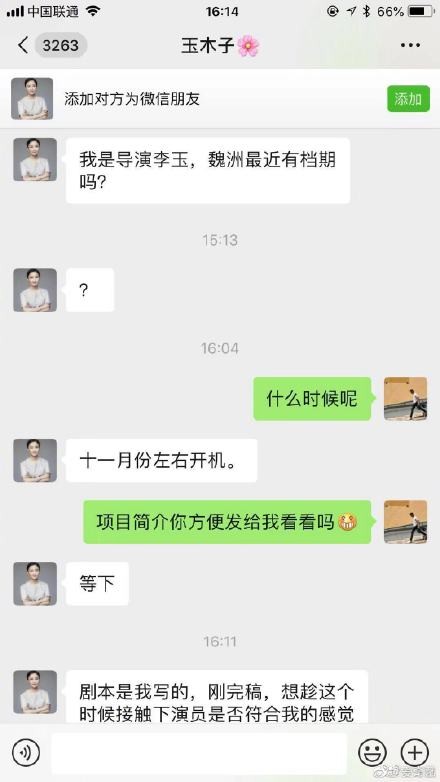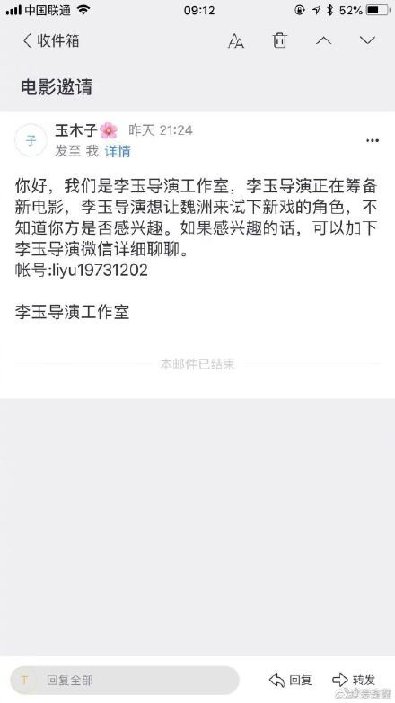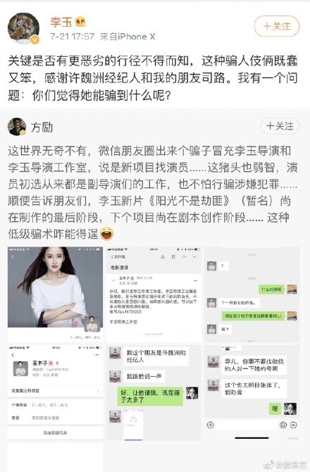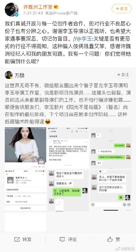 许魏洲李玉双方打假 今天晚上,制片人@方励 发微博称,有一位名为“玉木子”的骗子冒充李玉导演约演员试镜新戏,其中包括@许魏洲ZZ ,在己方提出看项目简介时找理由拒绝。随后李玉本人和许魏洲工作室双双发文打假,称“这种骗人伎俩既蠢又笨”。