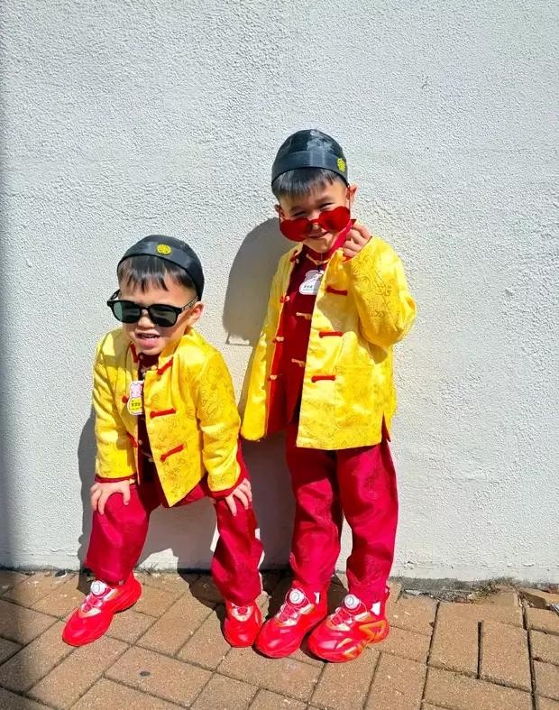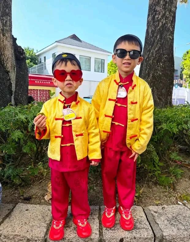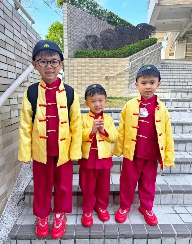 胡杏儿的三个儿子穿着黄马褂,内搭中式红装。