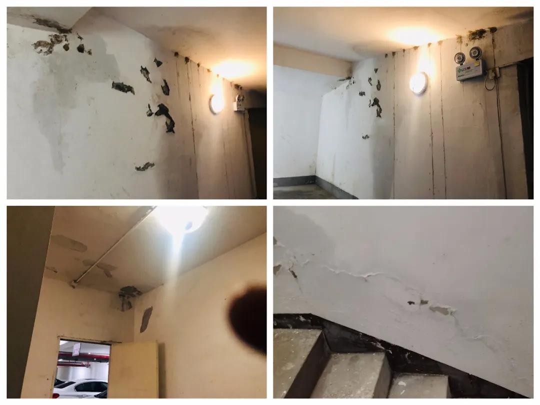 近期连续的大雨,导致小区地下车库积水比较严重,墙面和电梯都有漏水的现象。