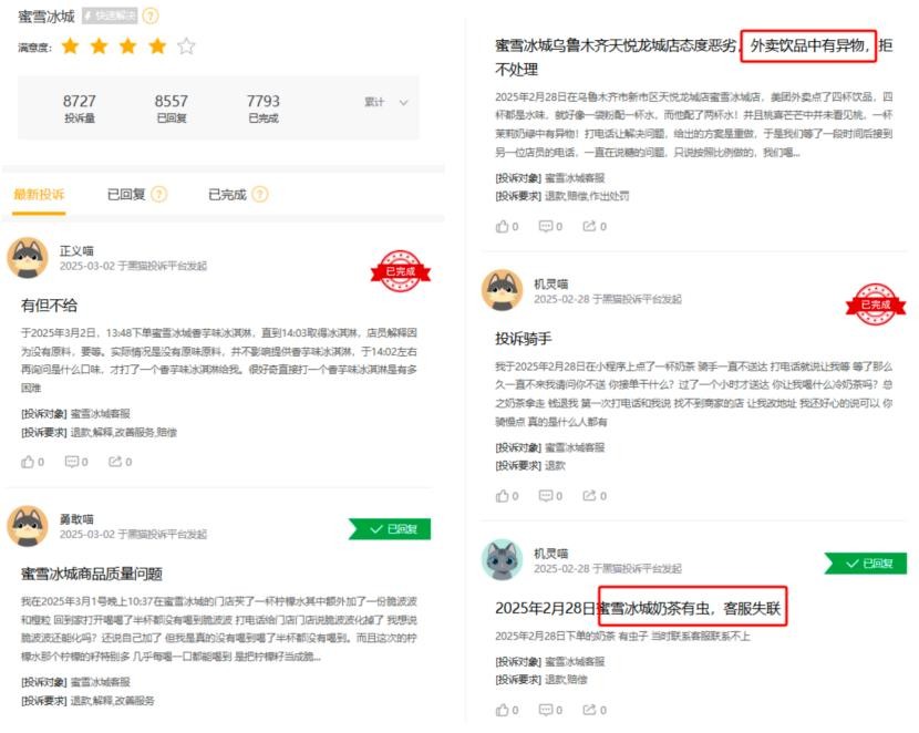 截至2025年2月底,黑猫平台上有关蜜雪冰城的投诉量累计达8727条,明显远高于目前已上市的这几家茶饮品牌,其中关于食品安全的投诉更是占大头,接近七成。