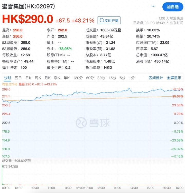 上市当日,其开盘价为262.00港元/股,较发行价上涨29.38%,对应总市值为987.90亿港元。截至收盘,报290.00港元/股,涨幅43.21%,总市值达1093.47亿港元,打破了新茶饮“上市即破发”的魔咒。