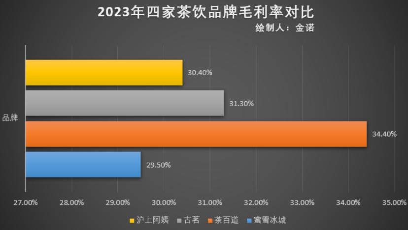 对比目前头部的四家加盟类茶饮品牌,蜜雪冰城在2023年的毛利率数据垫底,与最高的茶百道相差了有将近5个百分点。