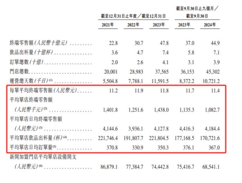 根据最新招股书披露,蜜雪冰城的单店终端零售额从2023年的144万元/年降至2024年前三季度的108万元/年,降幅高达25%。