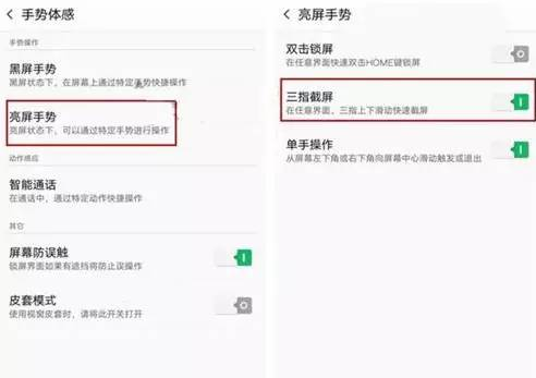 注意:此功能默认并没有开启,需要手动开启,以OPPO R11手机为例,依次进入设置 > 手势体感 > 亮屏手势 > 开启“三指截屏”