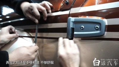 车身轮眉、前脸处的防擦条原本想采用皮质材料进行包履,但由于车身覆盖件之间的缝隙衔接比较紧密,加之皮质材料的耐久度欠佳所以采用了喷漆进行改色。用喷漆模拟皮革的效果同样颇具挑战,尤其皮革材料还没有准确的色号,只能通过目测进行调色,喷漆的厚度掌握直接决定了最终的色泽质感呈现。