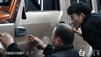 双拼色之间的过渡最考验设计和工艺,由于BJ40的车身线条格外硬朗,若直接将两种颜色拼接则会稍显突兀,所以我们采用了用三道腰线进行视觉过渡。