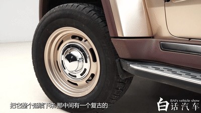 轮毂方面,我们选用了与原车尺寸相当的复古造型轮毂替换了原车的越野范轮毂,轮毂主体喷涂成了与车身同色的香槟金色,轮毂中心盖经过镀铬装饰的处理,精致感有了显著提升。