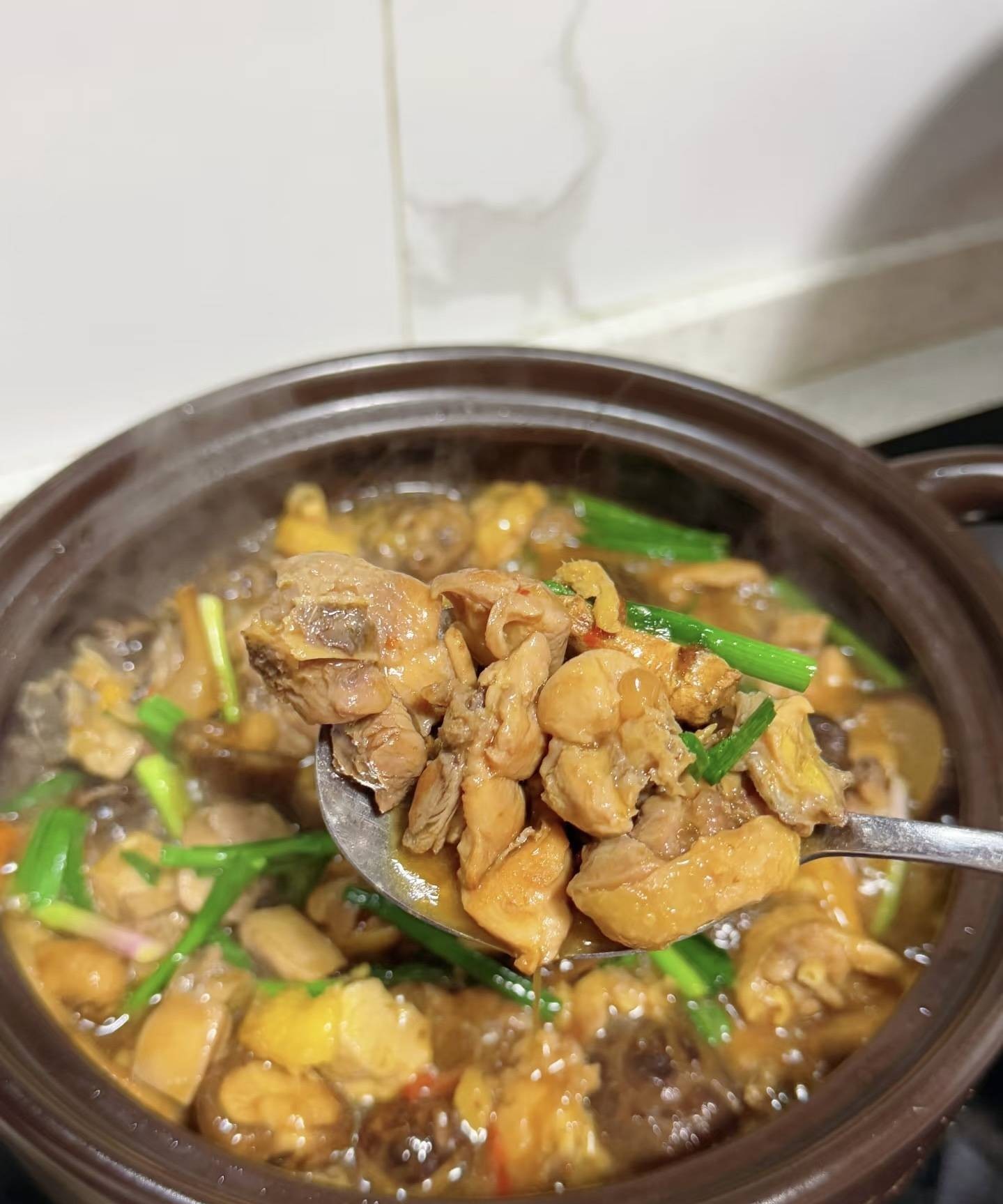 最后装盘,色香味俱全! 撒上葱花,热腾腾的香菇焖鸡煲就完成了,是不是色香味俱全,看着就让人食欲大增?