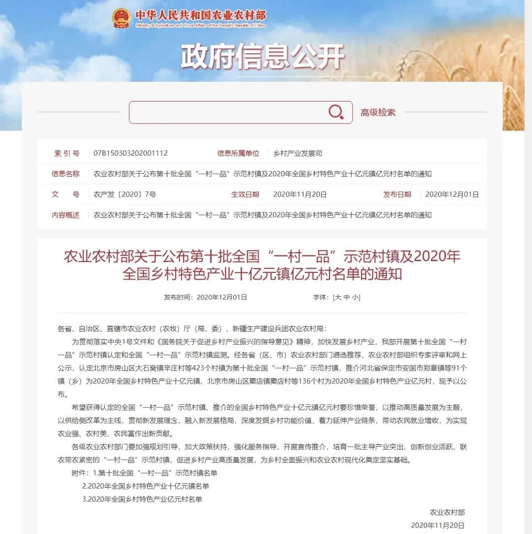 近日,根据《农业农村部办公厅关于开展第十批全国“一村一品”示范村镇认定工作的通知》(农办产〔2020〕6号),农业农村部组织专家对2020年全国乡村特色产业十亿元镇申报材料进行评审,经专家评审,农业农村部公示了2020年全国乡村特色产业十亿元镇名单,共有91个村镇上榜,江西省有2个村镇榜上有名,文港镇荣列其中!