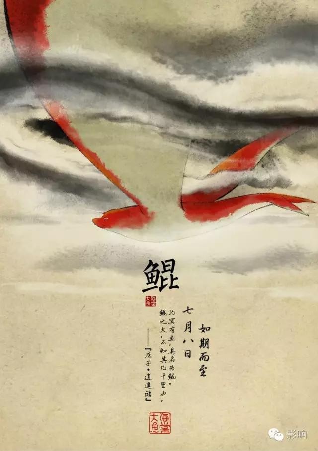 一张则是鱼形的鲲,正如《逍遥游》中刻画的那样,鲲展开了双翼在天空翱翔。